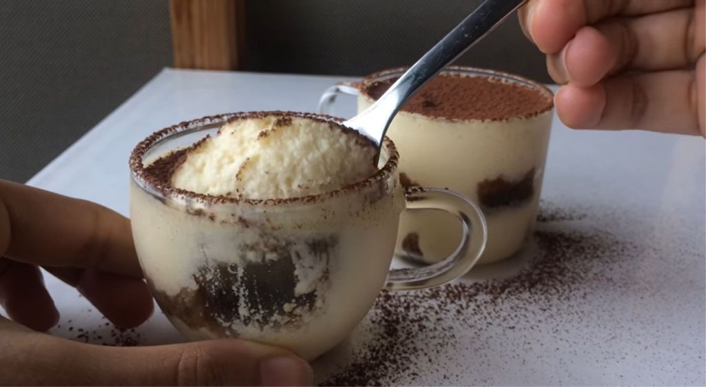 7. Continúe colocando capas de bizcocho empapado en espresso y crema de mascarpone hasta que haya usado los bizcochos, asegurándose de que la capa superior sea crema de mascarpone. Cubra los recipientes con film transparente o una cubierta similar y refrigere el postre por un mínimo de 4 horas, idealmente durante la noche.